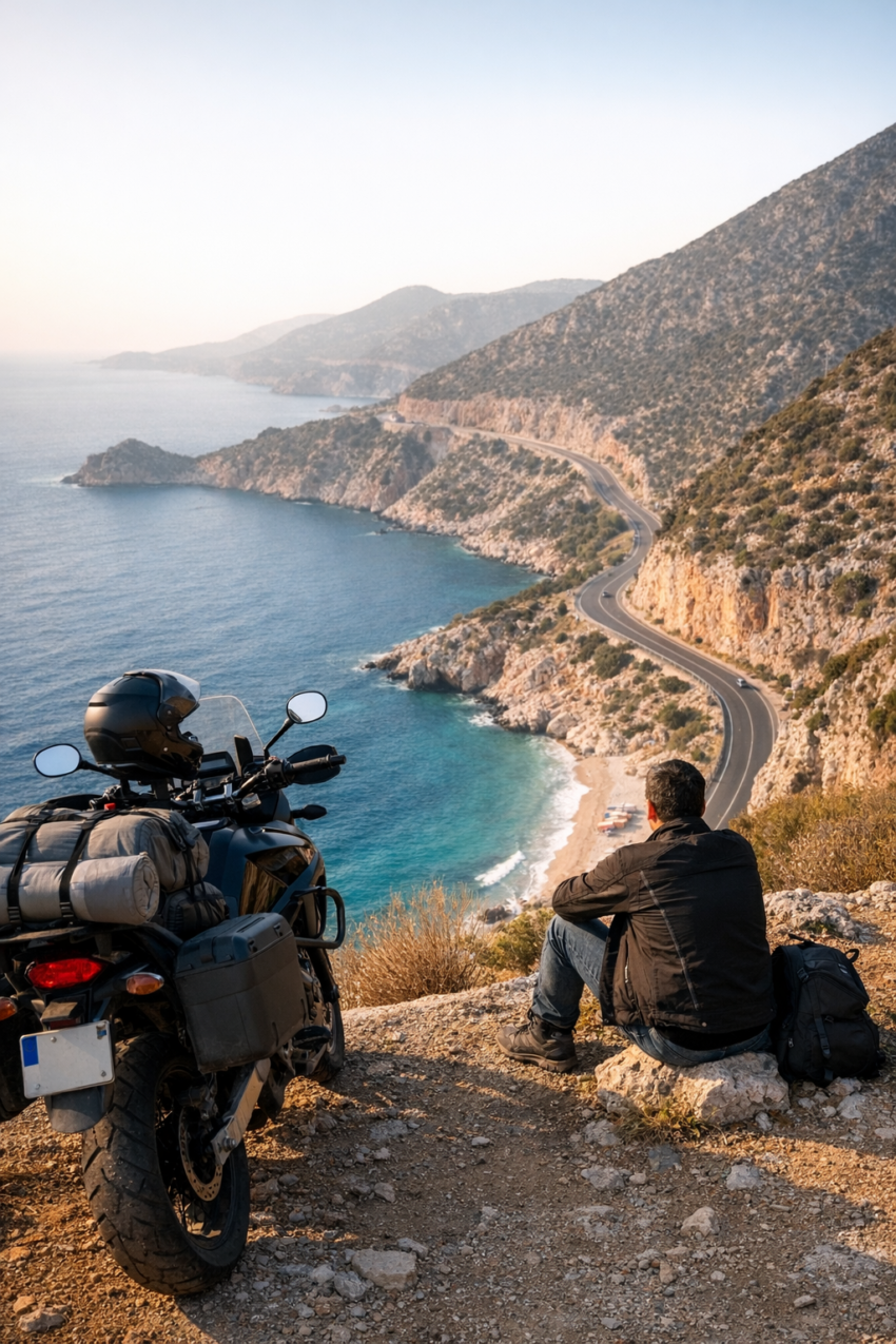 Antalya’dan sonra Kaş – Kalkan hattına girdiğinde zaman yavaşlıyor. Bir yanın uçurum, bir yanın deniz. Motorla bu yolu gitmek, fotoğrafa bakmak gibi değil; doğrudan içine giriyorsun.